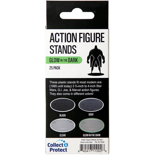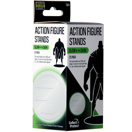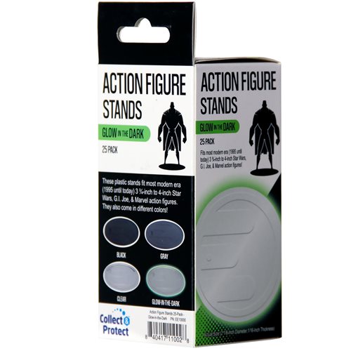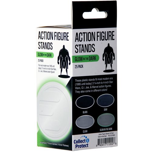 One Pack with 25 × Glow-in-the-Dark Action Figure Stands (UPC: 840417110028) — Each approx. 2 1/8-inch diameter with peg