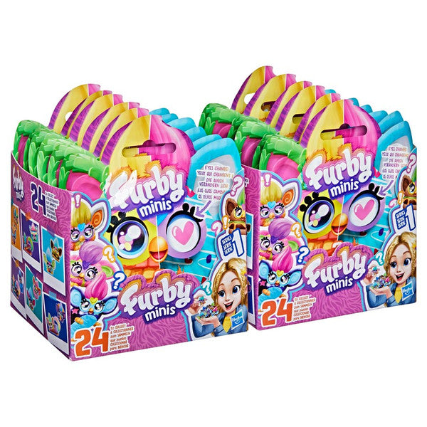 Complete Furby Mini Assortment Case of 12, each blind bag containing 2 mystery Furby figures with lenticular eyes and tufted hair. Case includes a total of 24 mini figures.